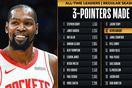 [流言板]杜兰特生涯投进2223记三分,超越克劳福德升至历史第十二位